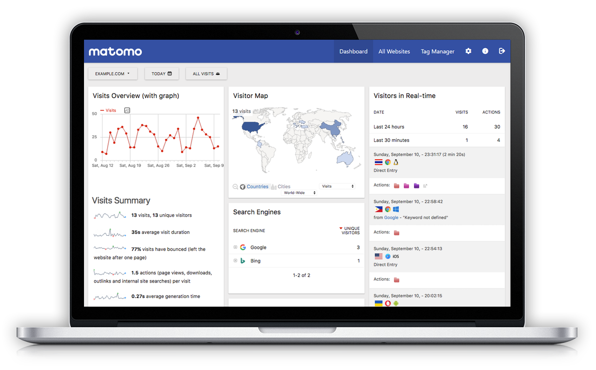 Matomo provides a range of amazing and innovative features, allowing you to get a 360 view of your visitors. These insights are invaluable to help understand behavior, keep track of goals, and increase conversion rates and revenue.