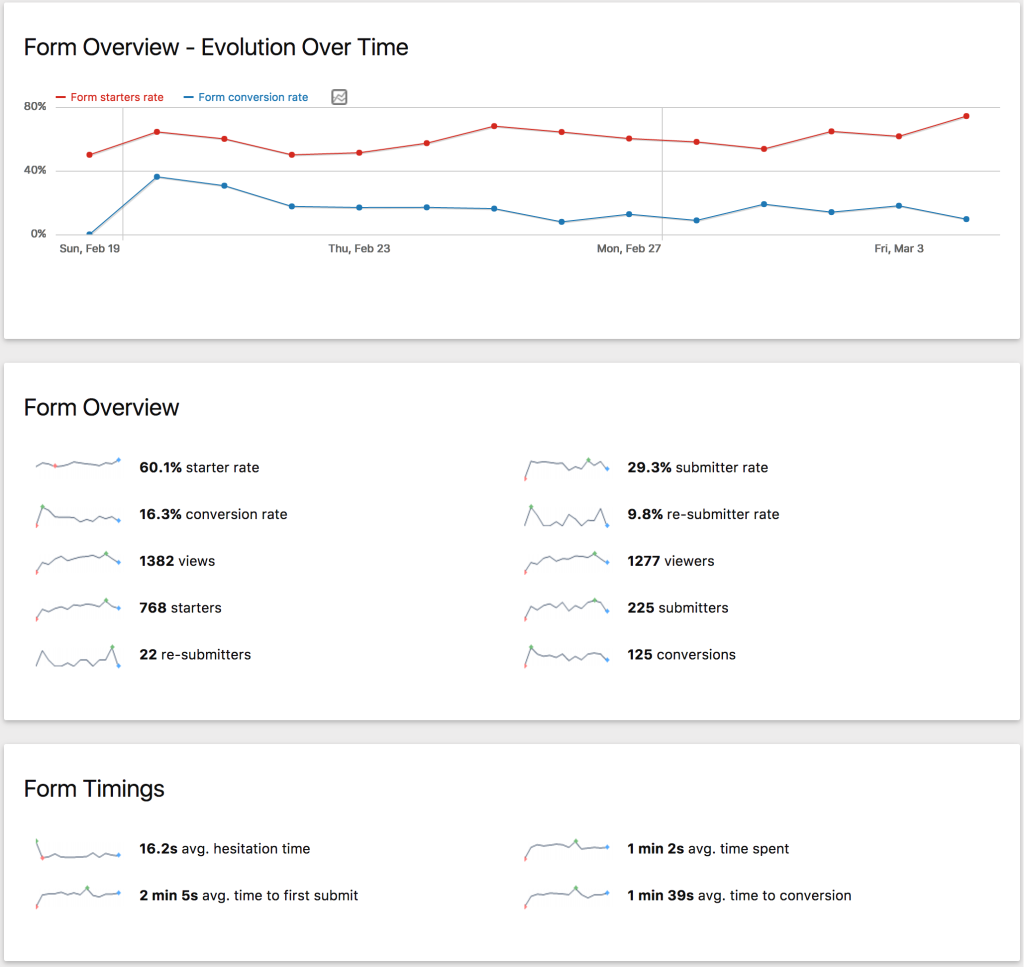 You can view metrics such as starter rate, conversion rate, average hesitation time and average time spent.