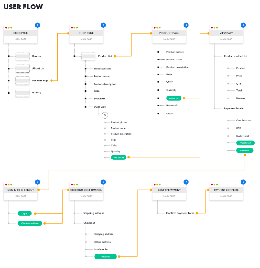 In e-commerce, the journey from product search to purchase is critical. A typical flow might start from the homepage, where users can either use the search function or navigate categories. Users then refine their search results, view product details, add items to their cart, and go through the checkout process.