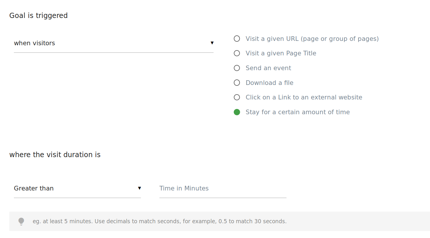 - #14508 New Goal type: Convert when user stays more than X minutes on the site [by @diosmosis]