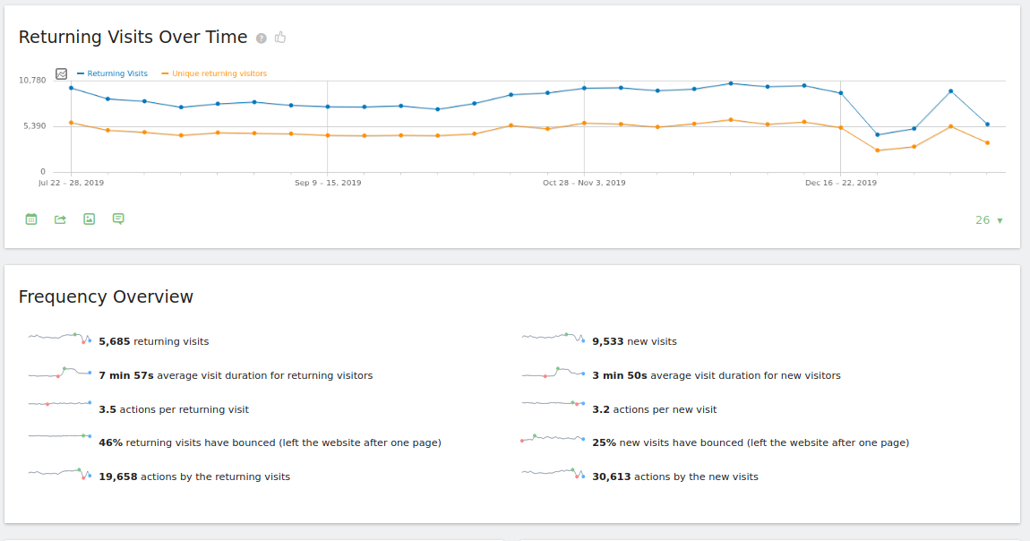 In terms of new features, we’ve improved the Behaviour > Engagement report, which will now clearly display all metrics for both Returning visits and New visits: