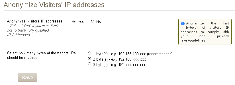 By default, IP Anonymisation is enabled in Matomo. This means Matomo stores in the database each new visitor IP address (ipv4 or ipv6 format) with the last components removed to protect user’s privacy. IP anonymisation is a good way to protect users with static IP address as otherwise their browsing history would be easily tracked across several days and even across websites tracked within the same Matomo server.