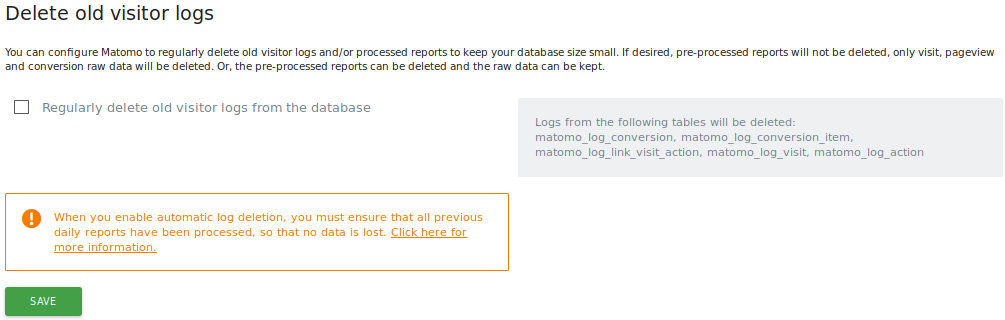 In Administration > Privacy > Anonymize data, under the section “Regularly delete old raw data” you can configure Matomo to automatically delete your old raw data (old visitor logs) from the database. For privacy reasons, we highly recommend that you keep the detailed Matomo logs for only 3 to 6 months and delete older log data.