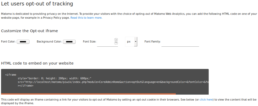 On your website, in your existing privacy policy page or in the ‘Legal’ page, you can actually add a way for your visitors to “opt-out” of being tracked by your Matomo server. By default, all of your website visitors are tracked, but if they opt-out by clicking on the iframe link, a cookie ‘piwik_ignore’ will be set. All visitors with a piwik_ignore cookie will not be tracked.