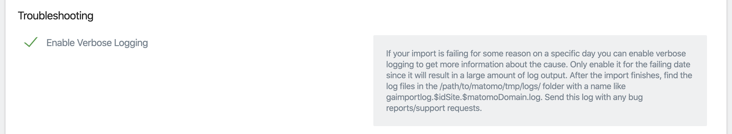 - Start a new import for the specific day that fails and check the “Enable Verbose Logging” checkbox at the bottom of the form: