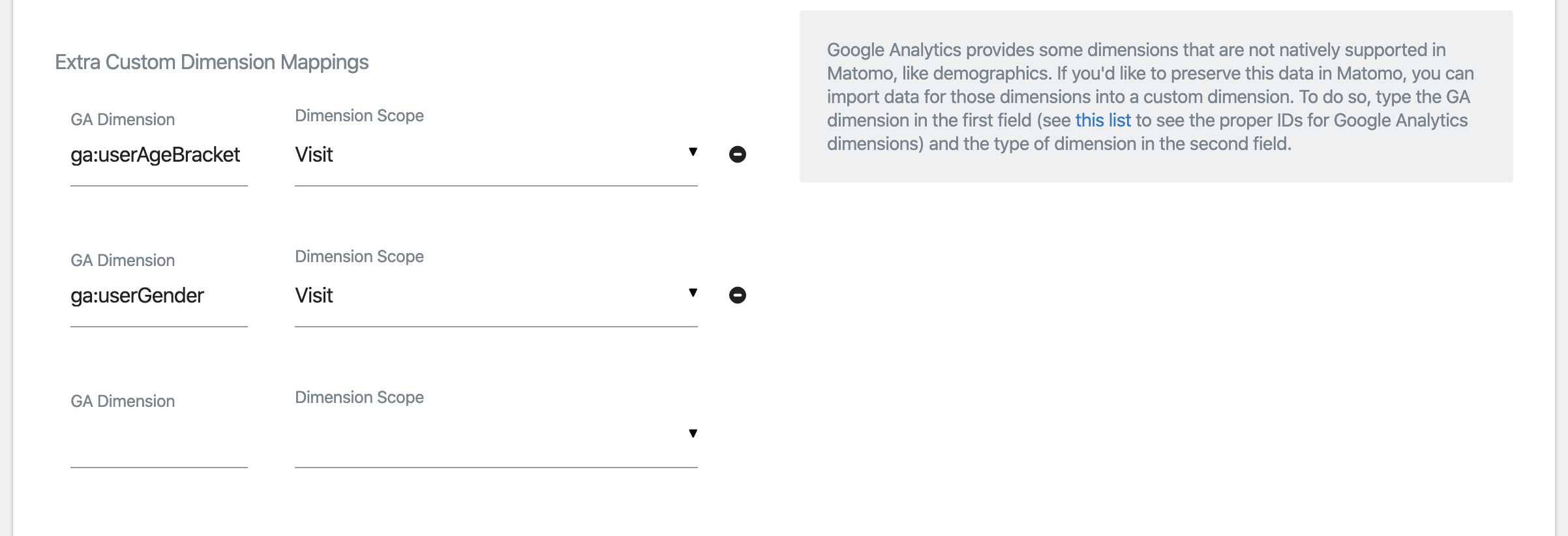 When importing, one custom dimension slot will be used up in the imported site for each extra mapping. (Note: there will be an error if there are not enough custom dimension slots in your Matomo.)