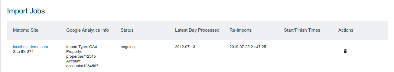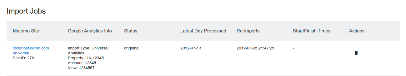 Once the import finishes, you can remove the authorisation you granted earlier. Matomo only needs access to Google Analytics while importing data, afterwards there’s no need to keep it.