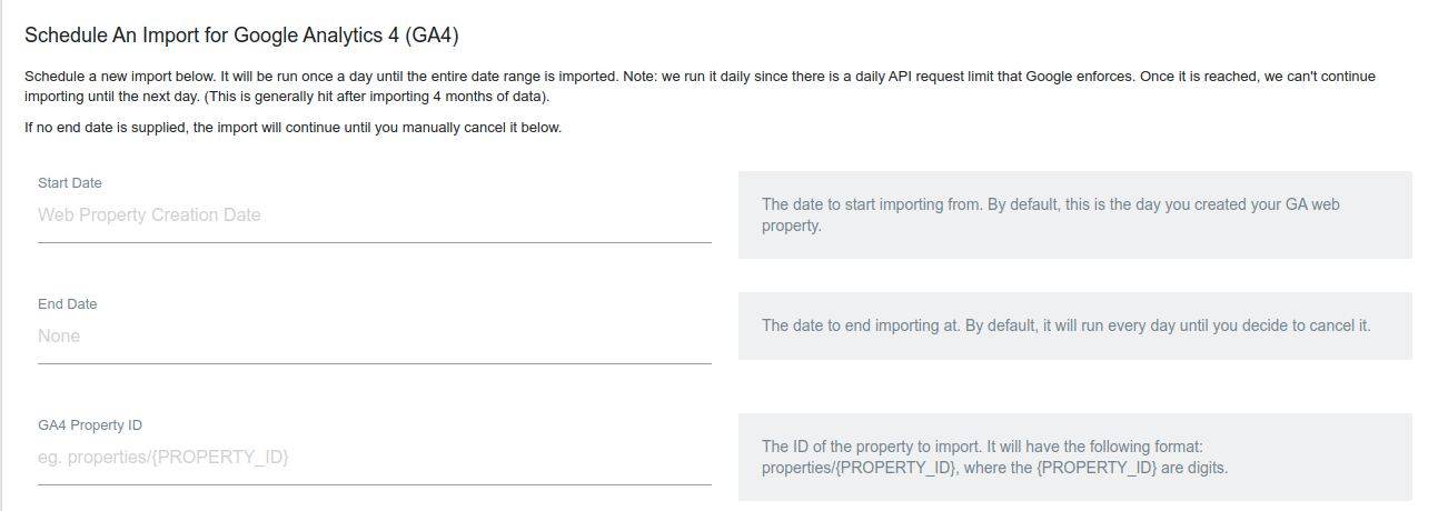 Forproperty-idsubstitute the GA4 property ID noted above. Fordatesspecify the date range of date you’d like to import, for example,2017-01-01,2022-04-31.