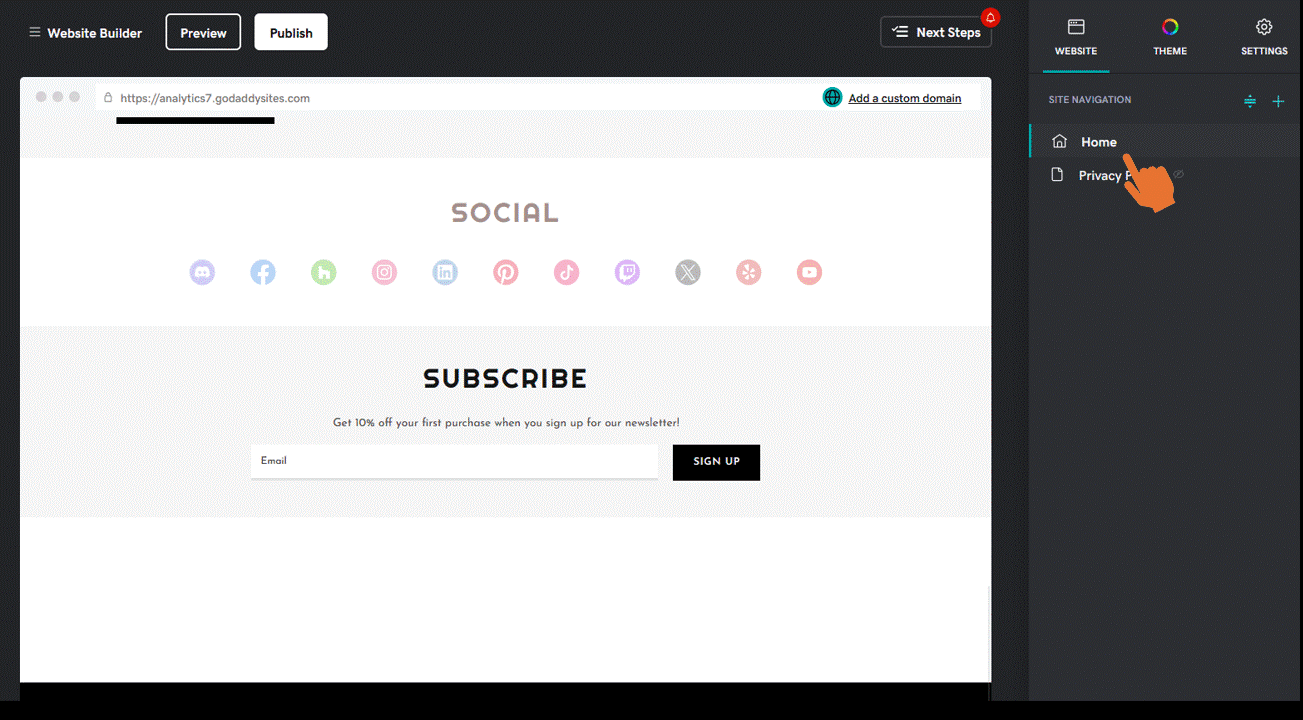 - In the Site Navigation panel, click on the page where Matomo tracking should be added.