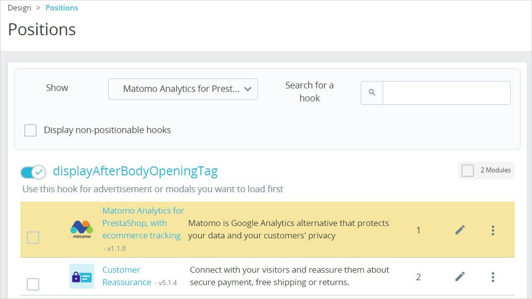 displayAfterBodyOpeningTaghook, click-and-drag the Matomo module to position 1 as shown in the example below. - Click Save.