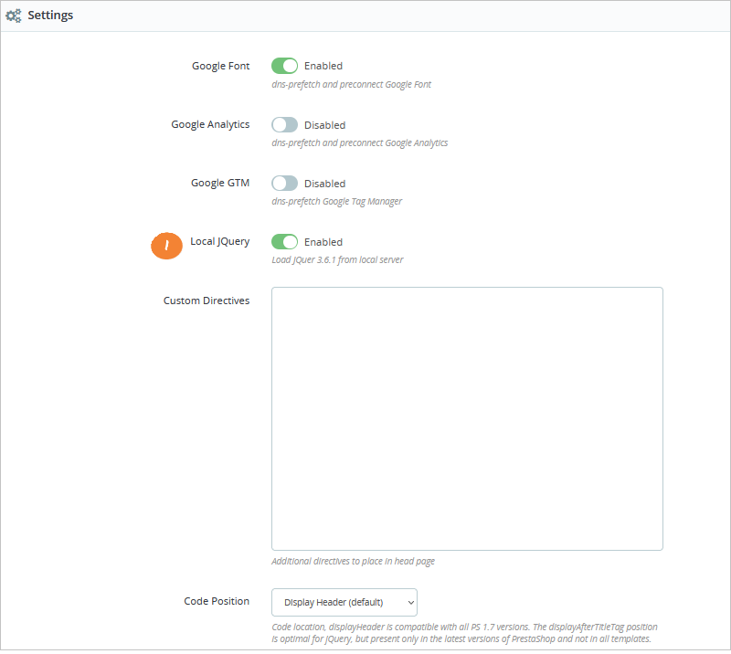 - Toggle the Local JQuery option (1) to enabled and click Save.