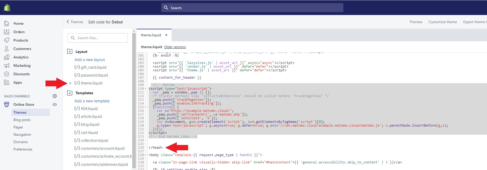 If you don’t want to track Ecommerce data in your Matomo instance, then you can follow the steps below to add the basic Matomo tracking code to your Shopify website.