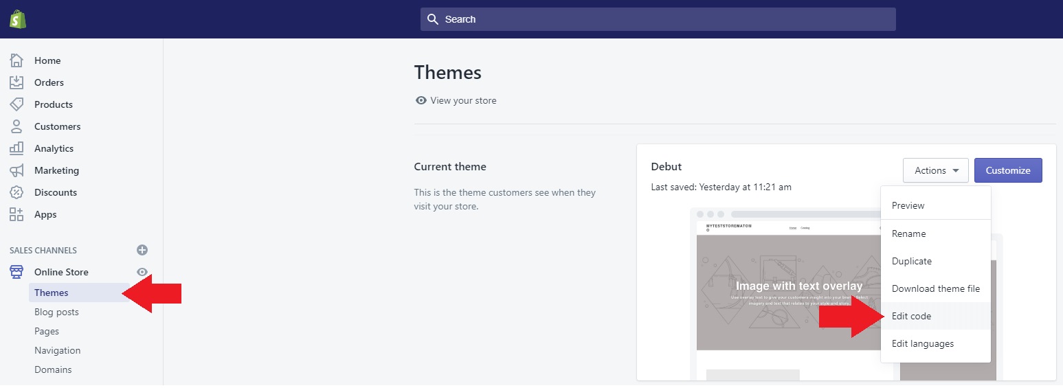 2. Login to your Shopify store. Select Online Store, then chose Themes from the dropdown menu. Select Edit Code from the Actions menu.