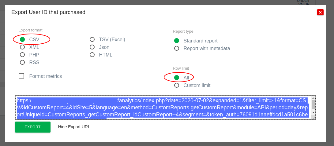 Important note: The token_auth that you see on this export screen is a session token_auth that will only be valid while you are logged in. Follow our guide to generate a token_auth.. Ensure the ‘token_auth’ does not have the option enabled for Only allow secure requests. This is especially important when using integrations that send tracking or reporting requests via GET. Read more about token behaviour with GET and POST requests.
