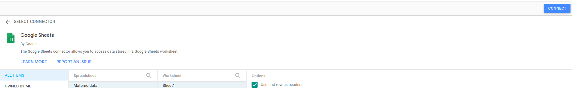 5. Select the spreadsheet created earlier (see section above) and leave the default options selected and click on Connect.