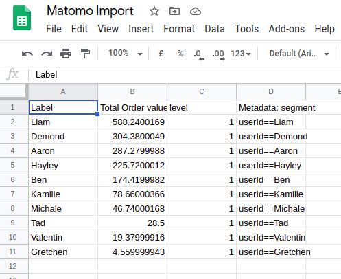 Note: Some Matomo reports contain a lot of data that Google Sheets may not accept without further modification of the sheet. The code supplied is not supported by Matomo as this is just an example of how to achieve the connection.