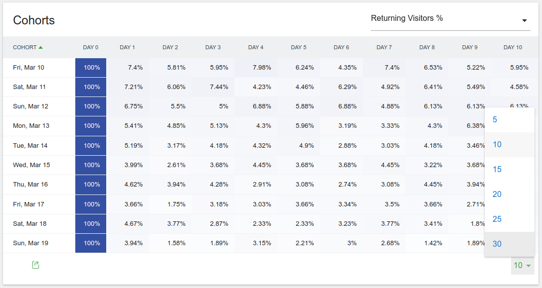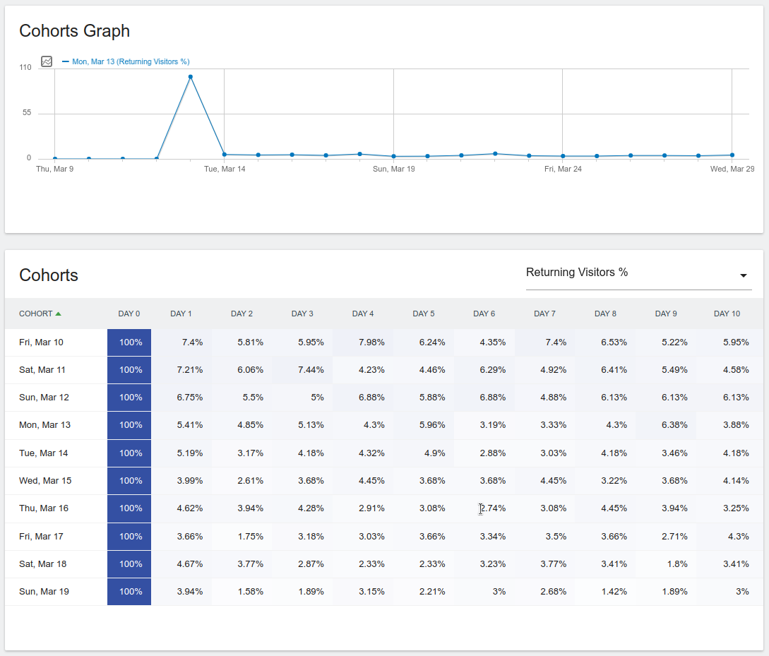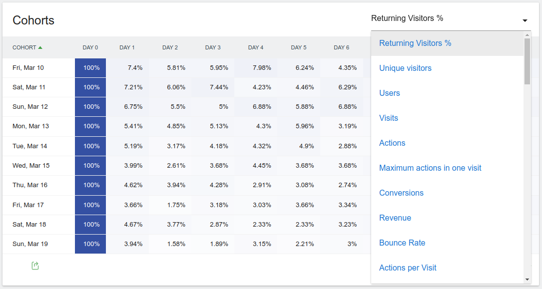 By default, the metric displayed is “Returning Visitors %”, which is the percent of visitors in the cohort that visited again for the column. This metric can be used to see when users stop visiting your website.