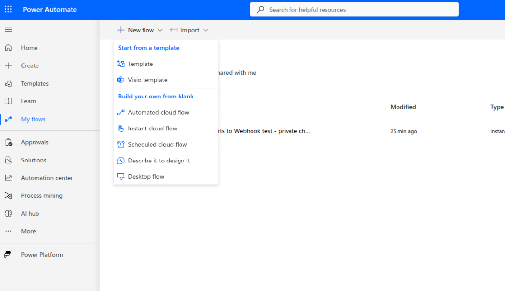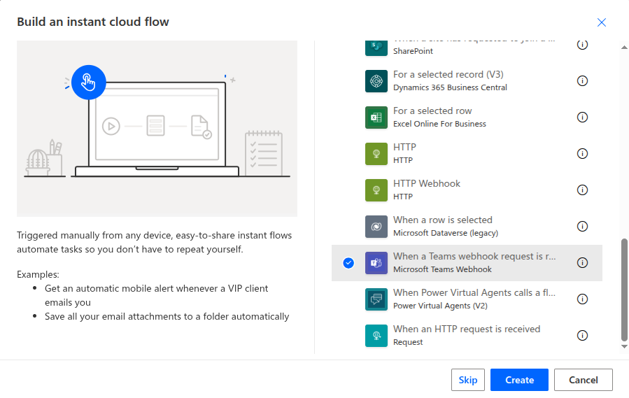 - Select When a Teams webhook request is received by scrolling down in the list and click Create.
