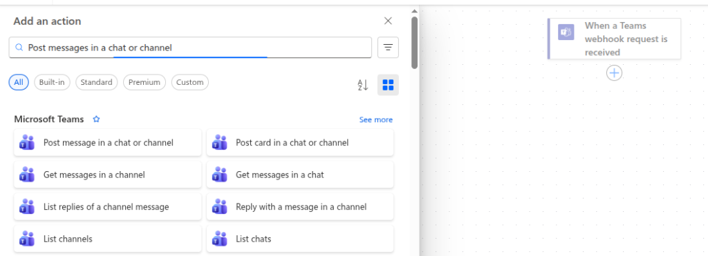 - Search for Post messages in a chat or channel and select Post messages in a chat or channel under Microsoft Teams.
