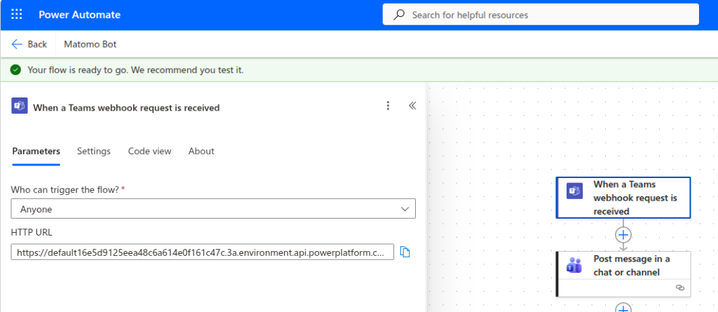 @{triggerBody()?['text']}. - Select the option, When a Teams webhook request is received.