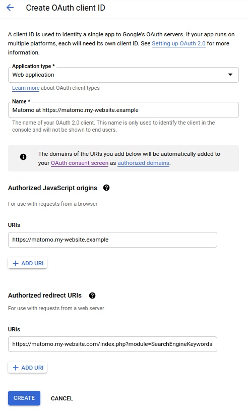 Note: This needs to be a domain. If you have installed Matomo into a subdirectory, you need to enter the domain without the path. (sohttps://my-website.examplein case ofhttps://my-website.example/matomo/). - Click on Add URI under Authorized redirect URIs. This needs to be set to your Matomo URL with this special URL/query
