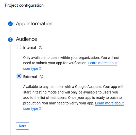 - Select the Audience: Internal or External. If you create an External app, it will start in testing mode; if you create an Internal app, you do not need to submit the app for verification.