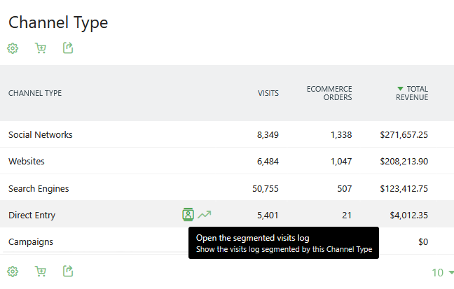 The Ecommerce Sales report by Channel Type shows which channels (e.g., Social Networks, Search Engines, Campaigns) led to Ecommerce conversions. Each row includes the number of conversions attributed to that channel type with the option to view the channel’s segmented visit log.