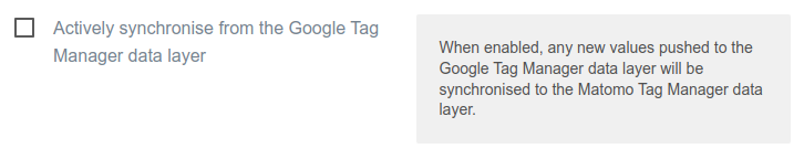 Starting with Matomo 5.2.0-b3, there is a container setting that allows GTM data layer events to be actively synchronised to the MTM data layer. Previously, there was no built-in way to do this. A community member provided this example of how to synchronise events from the GTM layer, by updating the code on your website. Using the example, we successfully implemented the new setting. To prevent a sudden change in system behaviour, the new setting is off by default for existing MTM containers and set to on when creating new containers.
