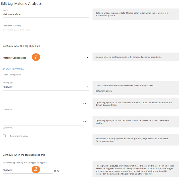 Go to Tags and check the predefined Matomo Analytics tag is added with the Matomo Configuration variable (1) and Pageview trigger (2) selected.