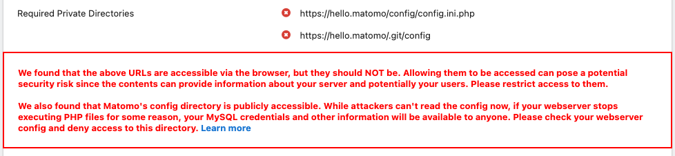 In the Matomo System Report you may see an error that says “Required Private Directories” and looks like this: